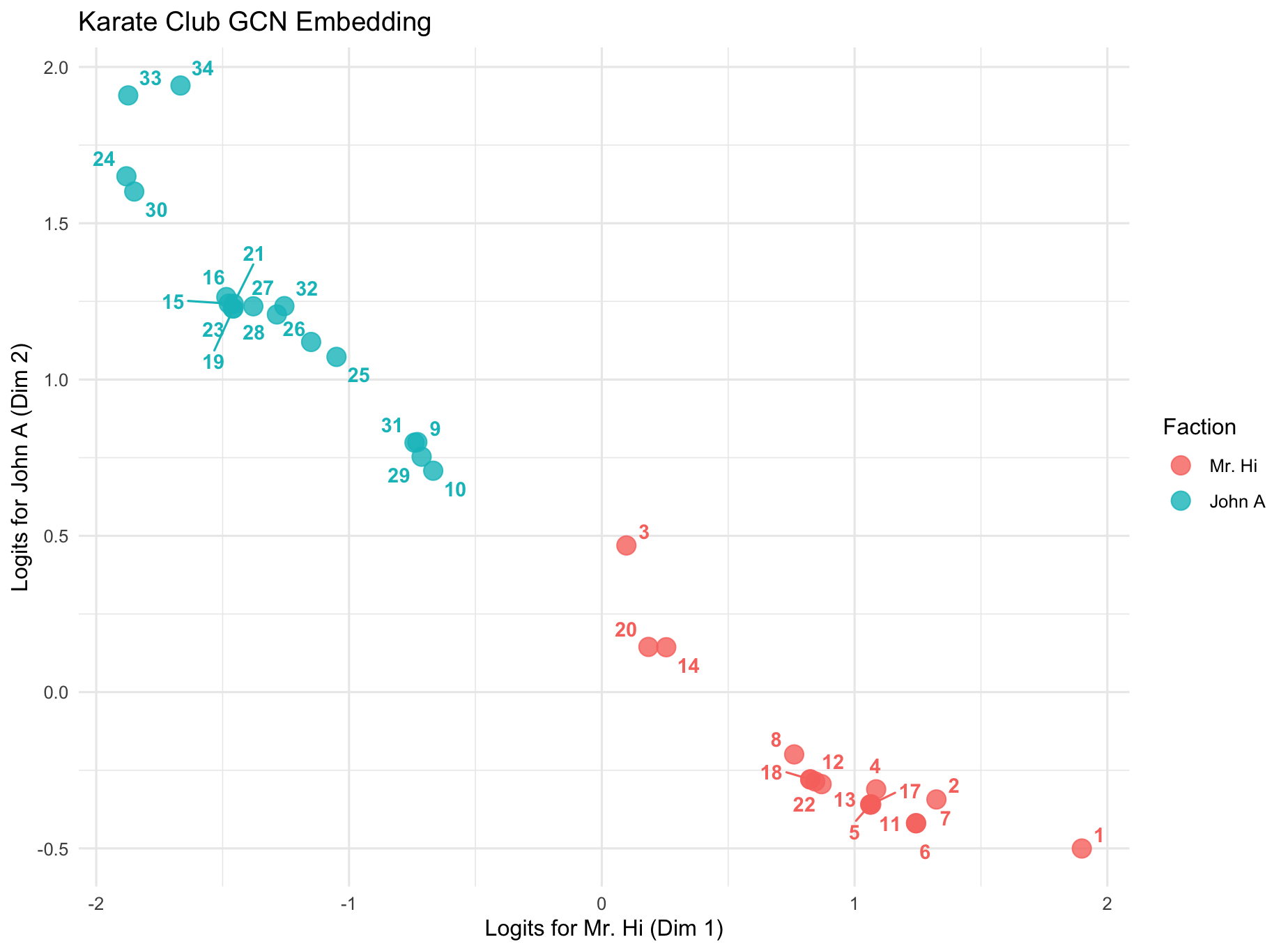 # Node 1 是教练 (类别0), Node 34 是主管 (类别1)