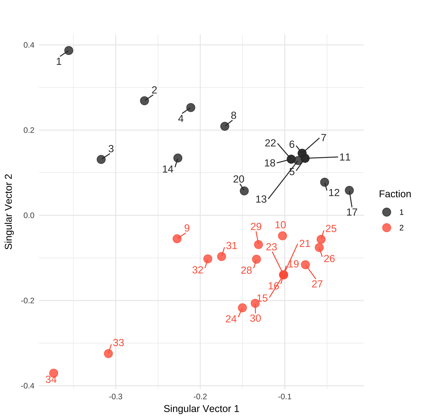 在网络中边的表示为 1-- 2 1-- 3 1-- 4 1-- 5 ...,转化为矩阵形式就是判断两两关系是否存在,存在关系则记为 1,二维空间表达见 图 10.2 (a),这个矩阵也被称为邻接矩阵 (Adjacency Matrix)。从传统统计视角看,有了这个矩阵,各个网络节点的空间表征可以通过奇异值分解来计算获得,比如将列信息放在二维空间上,其远近关系见图 10.2 (b)。