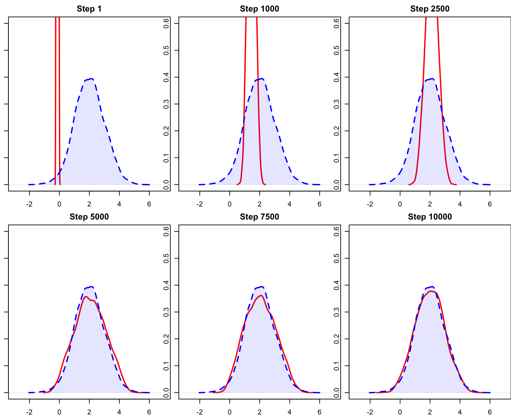 - Step 1000-2500:红线逐步移动到了 \(x=2\) 附近,方差也开始变大了。这是一个非常典型的 GAN 早期特征。生成器通过梯度下降,最先学到的是“数据在哪儿”(一阶矩/均值)。它发现只要把数据都堆在 2 附近就能骗过早期的判别器,但还没学会“数据长什么样”(二阶矩/方差)。