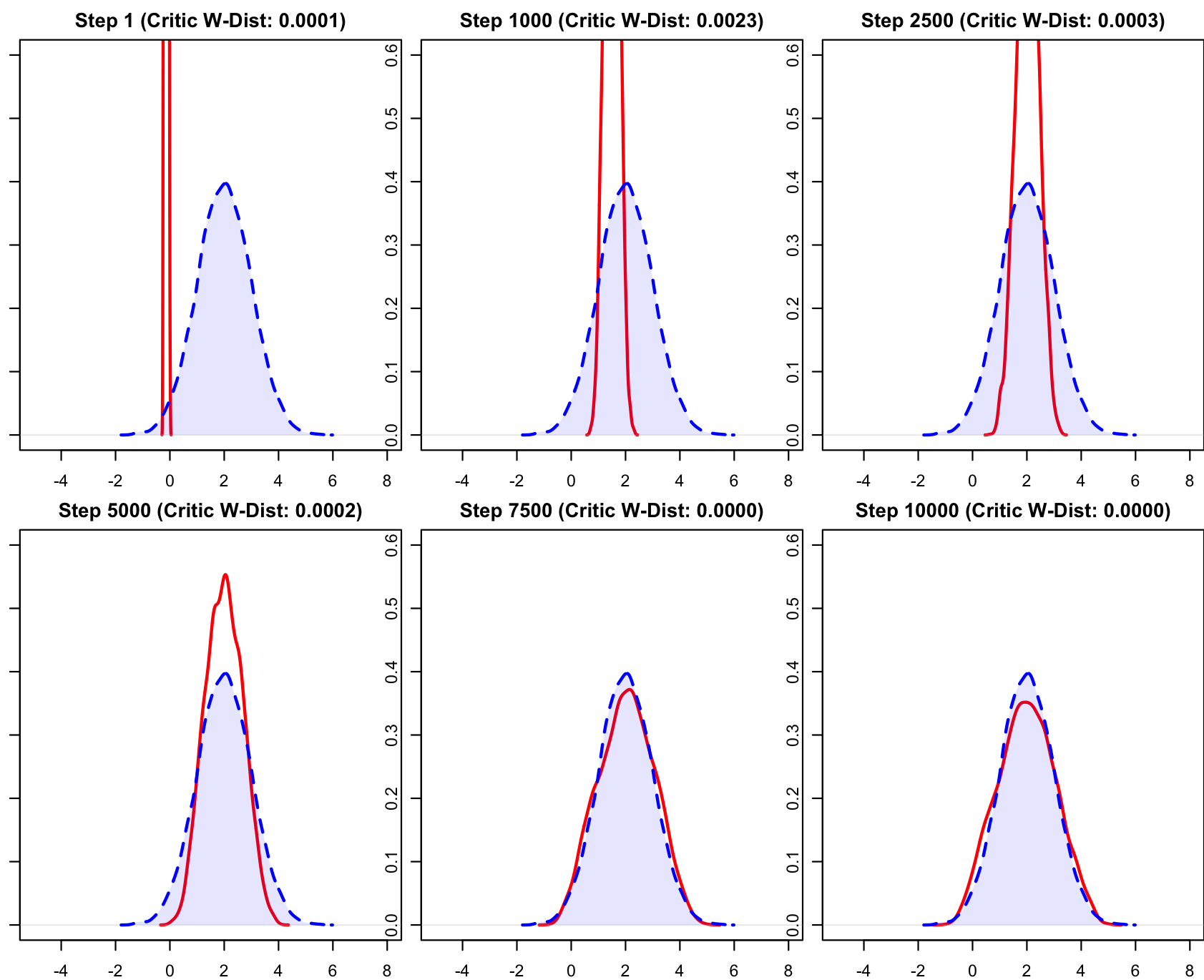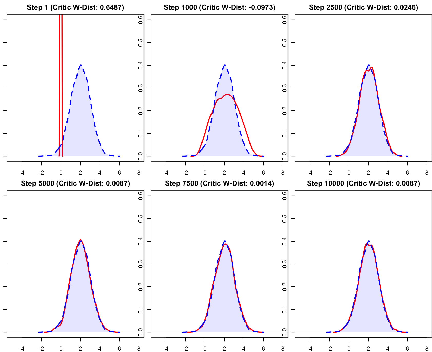 - Step 1:红线(生成数据)是一条位于 0 附近的细线,完全偏离蓝线(真实数据)。模型刚初始化,权重是随机的,生成器处于“瞎猜”阶段。
