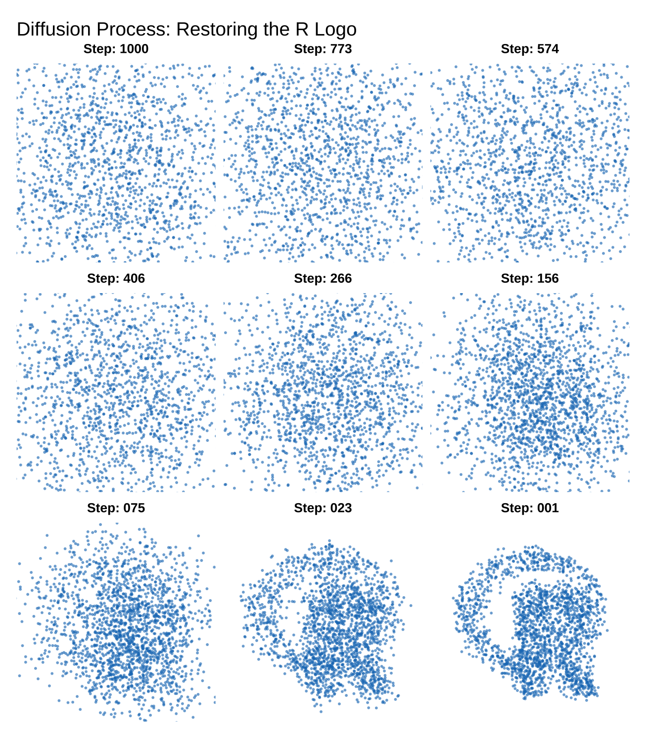 - 前向过程:将 R Logo 的坐标点 \(x_0\) 逐步混合高斯噪声,直至其退化为纯噪声 \(x_T\)。